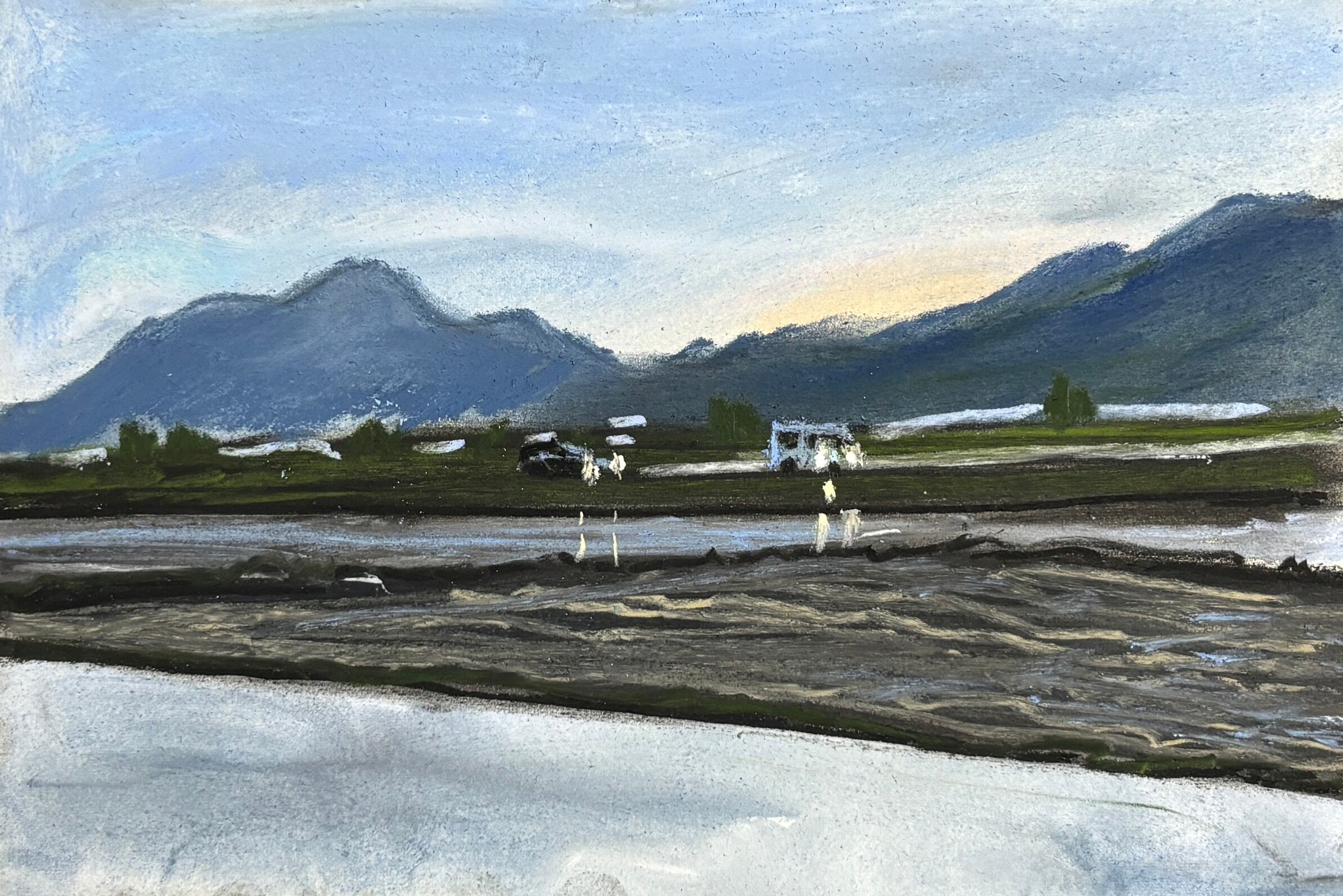 帰宅の車のヘッドライトが田の水面に伸びて。
